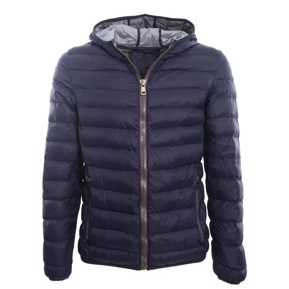 Piumino uomo leggero con impunture orizzontali, chiusura con zip, due tasche anteriori con zip.