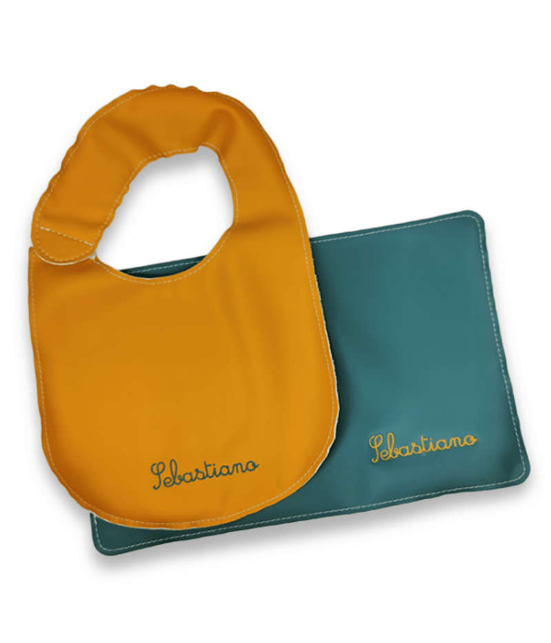 Rendi ogni merenda speciale con il nostro kit merenda per bambino, composto da una bavetta e una tovaglietta nei vivaci colori giallo e verde petrolio. Realizzato artigianalmente in Italia, questo set è in teknoskin, materiale di alta qualità che garantisce comfort e facilità di pulizia e la personalizzazione con il nome ricamato aggiunge un tocco unico e speciale. Perfetto per la scuola o le uscite, questo kit merenda è un accessorio indispensabile per i piccoli, personalizzalo ora!